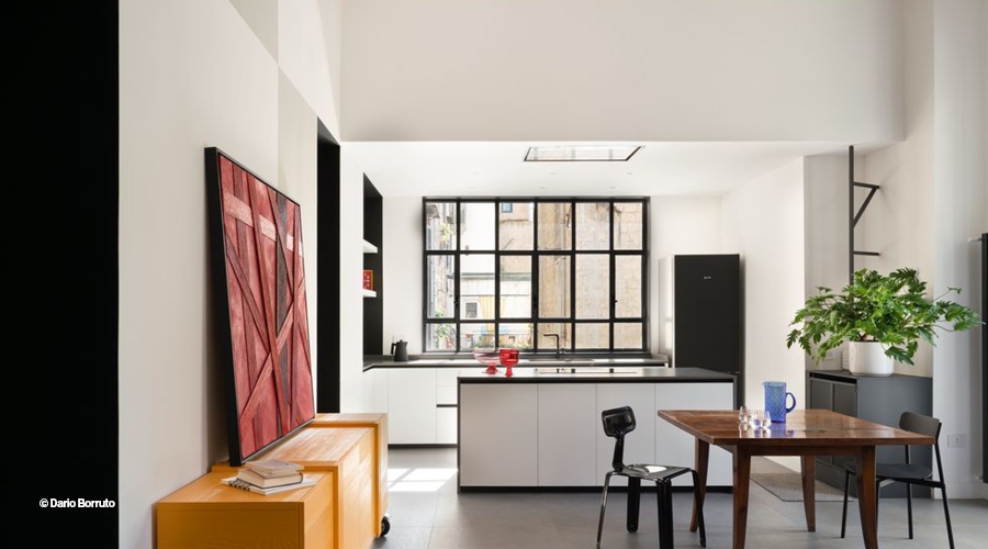La zona cucina open è, infatti, parte integrante della casa, completamente illuminata dalla luce della vetrata che amplifica lo spazio ed esalta i colori. Madie, quadri e oggetti decorativi variopinti si accostano ai materiali freddi dallo stile industrial in acciaio oppure alle calde tonalità, come quelle del legno o di alcune opere d'arte in corda.